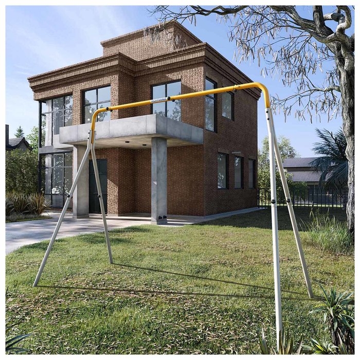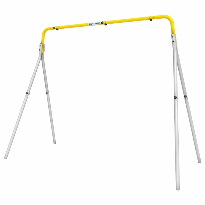 Конструкция для подвешивания детских качелей выполнена из стали и покрыта защитной эмалью. Эмаль предотвращает коррозию металла, а также делает материал устойчивым к атмосферным осадкам.