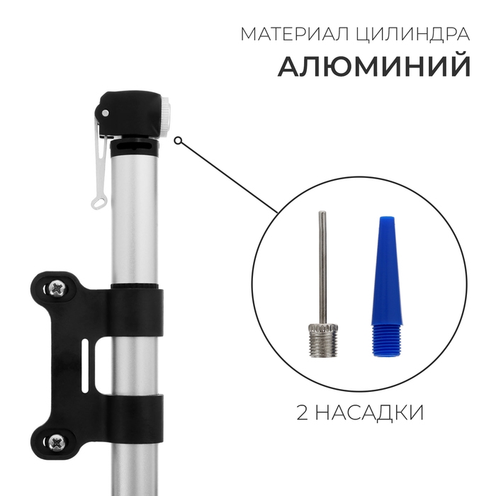 Компактный ручной насос выполнен из алюминия и имеет небольшой вес. Насос позволяет создать давление до 6,5 атмосфер. В комплект входят игла для мячей и насадка для надувной продукции.