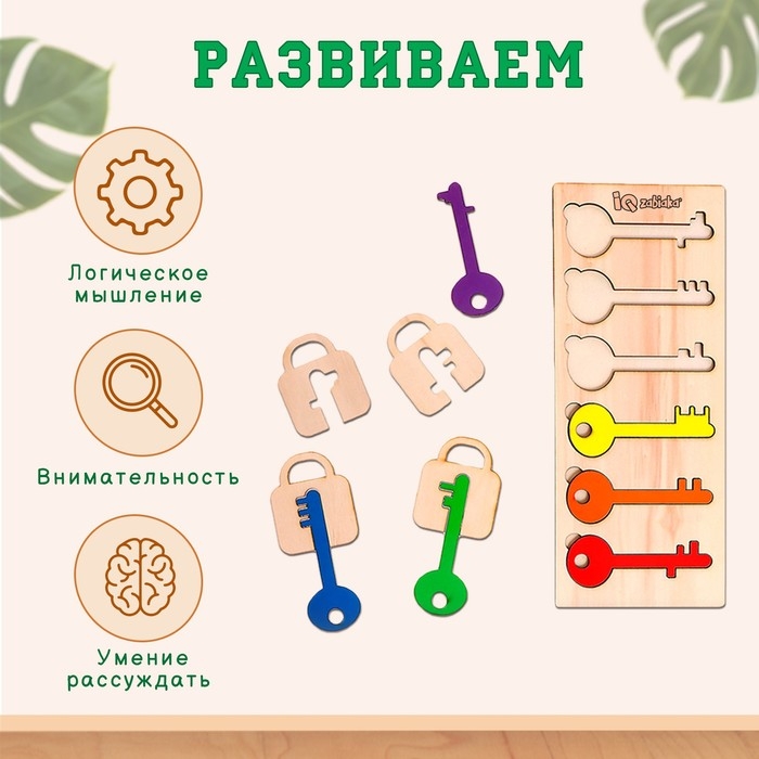 Развивающий набор «Подбери ключик» поможет малышу потренировать мелкую моторику, визуальное восприятие и внимательность.