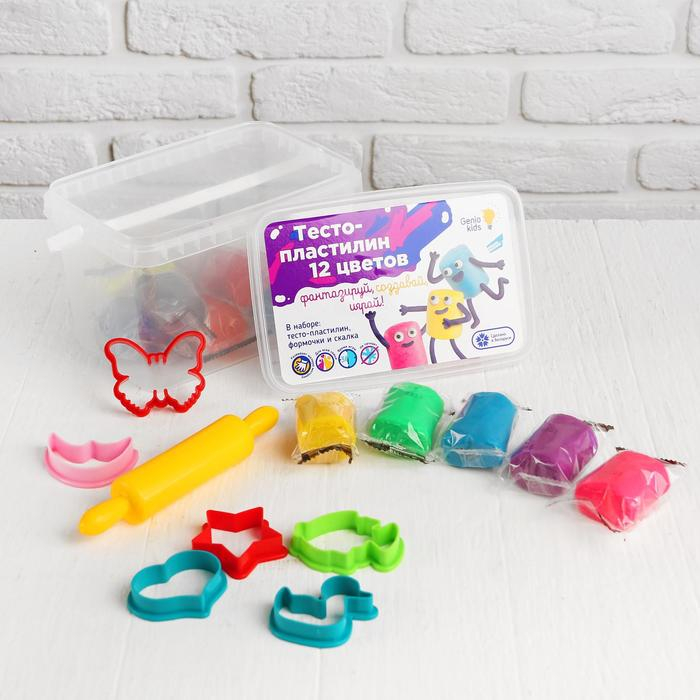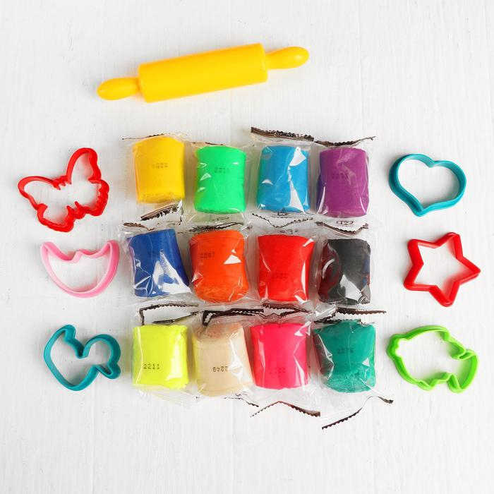 Тесто-пластилин, 12 цветов, 6 формочек + скалка: 16 см