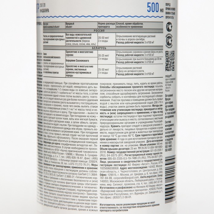 Способ применения: Опрыскивание вегетирующих растений и почвы в апреле-сентябре=