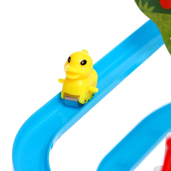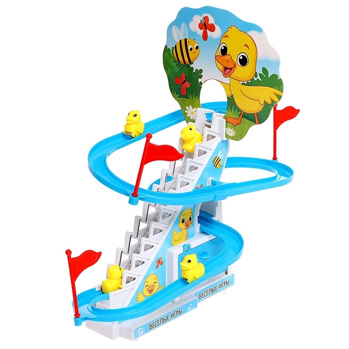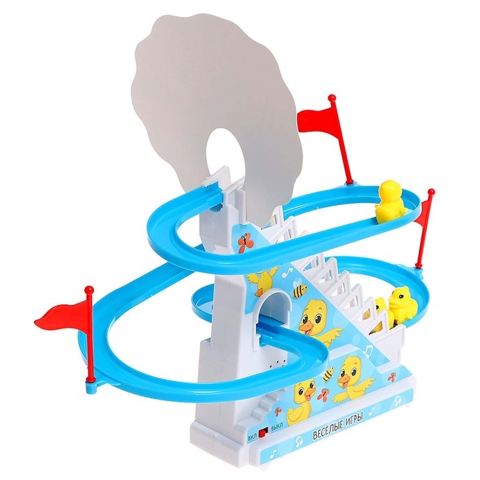 - Утята сами поднимаются по эскалатору и скатываются с горки.