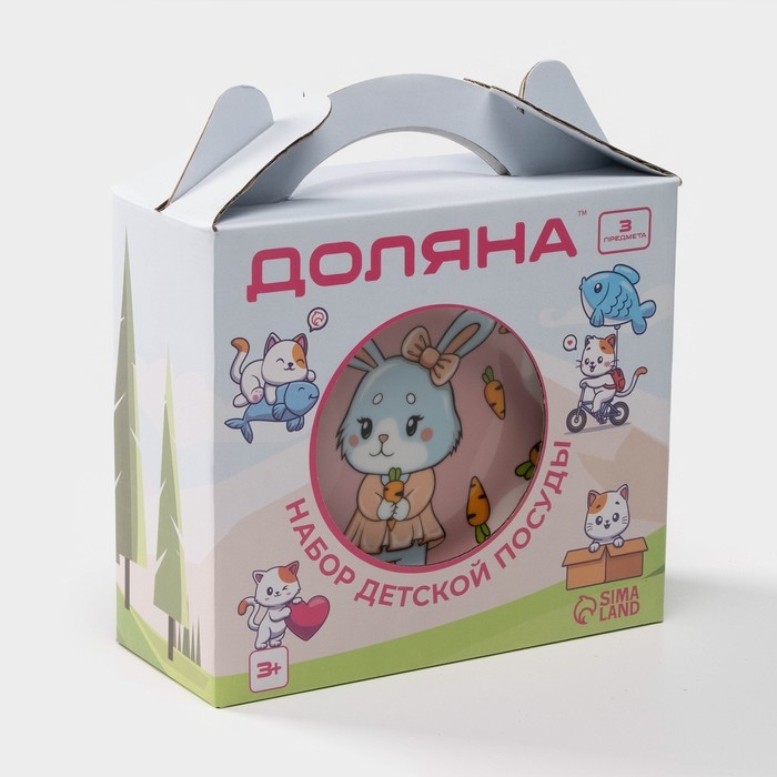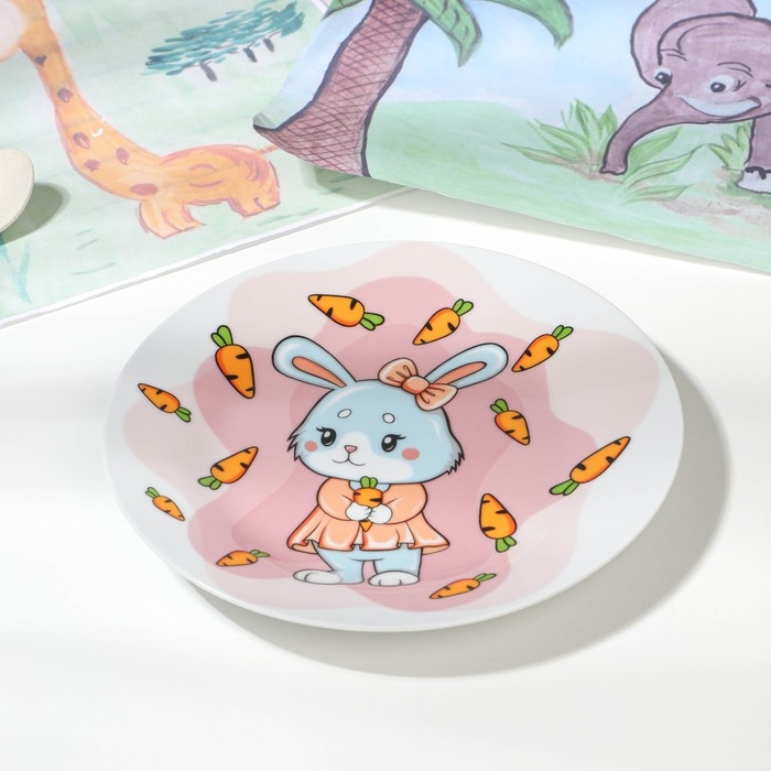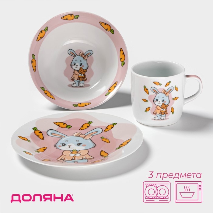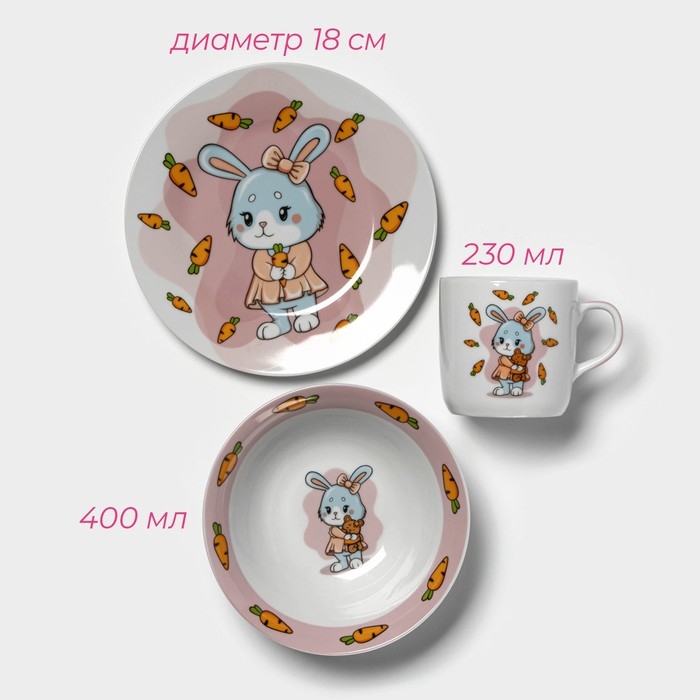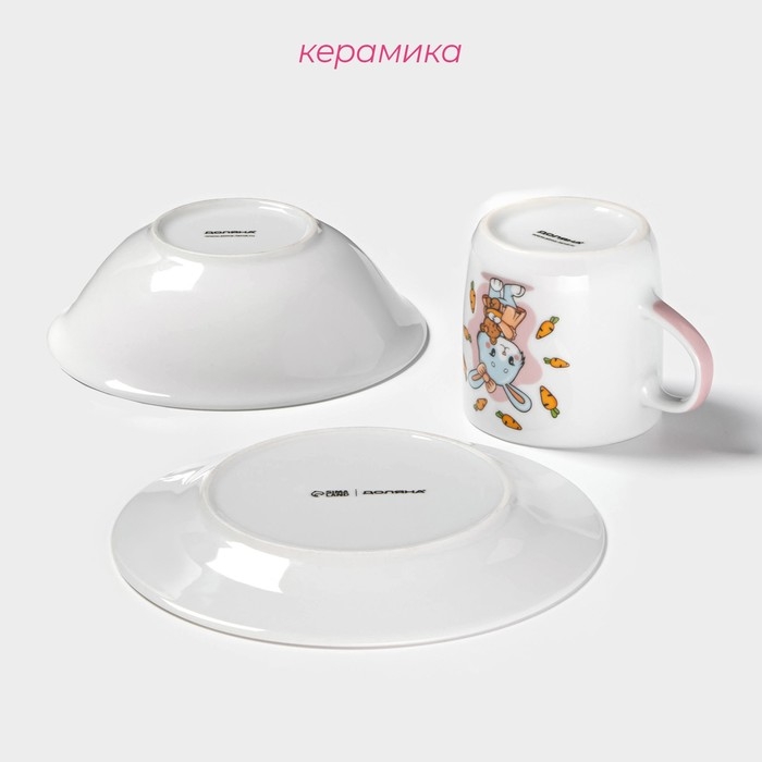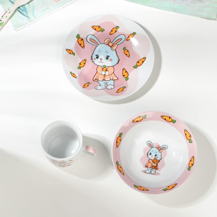 Набор детской посуды из керамики Доляна «Лапочка зайка», 3 предмета: кружка 230 мл, миска 400 мл, тарелка d=18 см