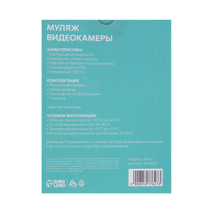 Муляж уличной видеокамеры Luazon VM-5, с индикатором, 2xАА (не в компл.), черный