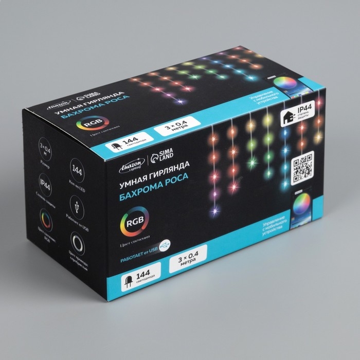 Умная гирлянда «Бахрома» 3 × 0.4 м роса, IP20, серебристая нить, 144 LED, пульт ДУ, приложение, свечение RGB, USB