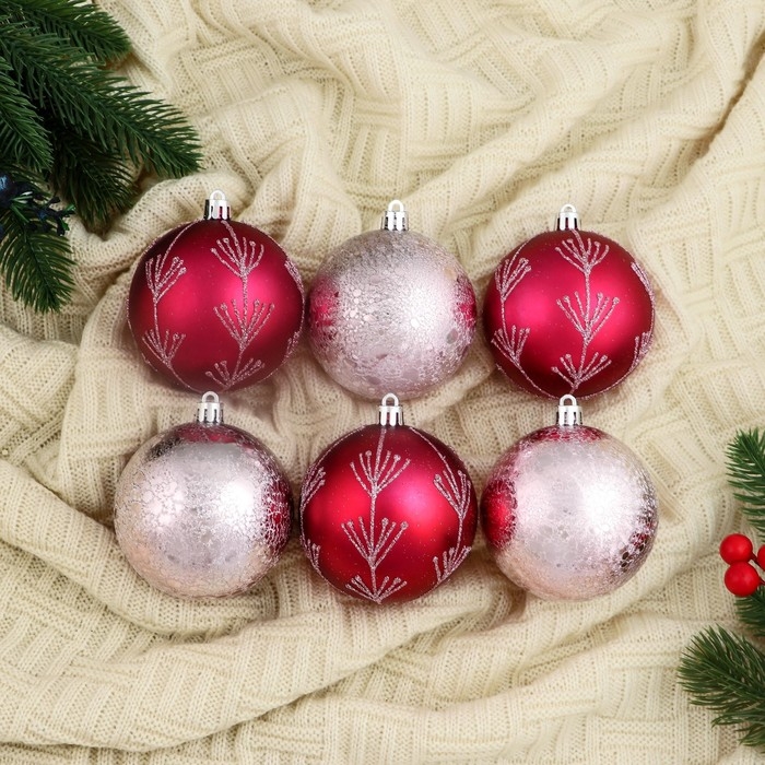 Набор шаров пластик d-8 см, 6 шт "Ночка" веточки, красный розовый