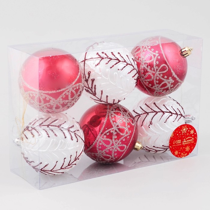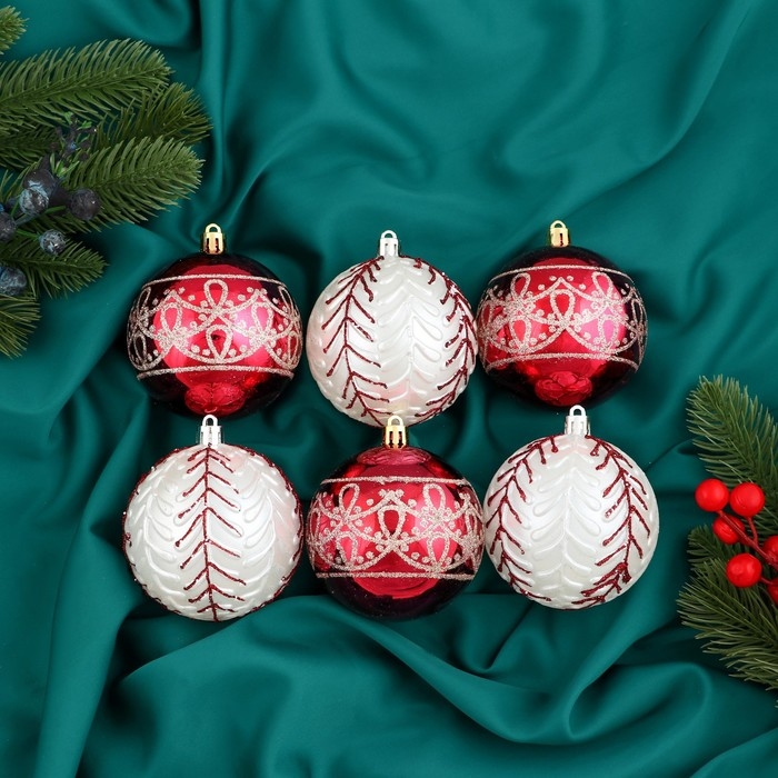 Набор шаров пластик d-8 см, 6 шт "Ночка" орнамент, красный белый