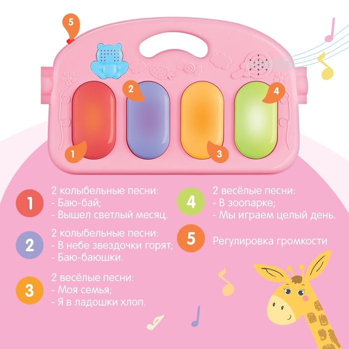 Нажимая на яркие клавиши, малыш будет слушать красивые мелодии и детские песенки, а также развивать музыкальный слух, чувство ритма, мелкую моторику и умение распознавать звуки.