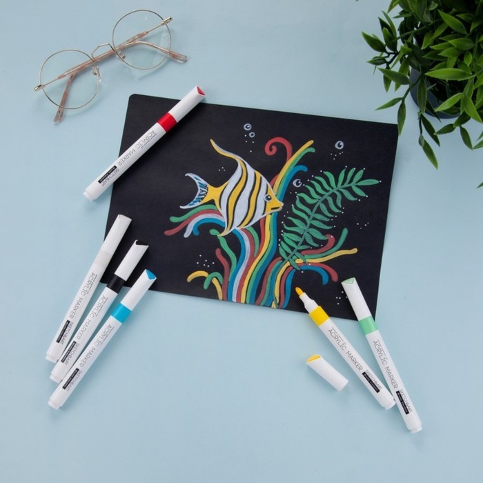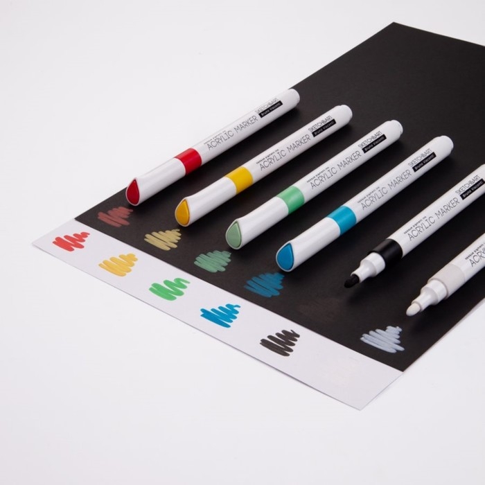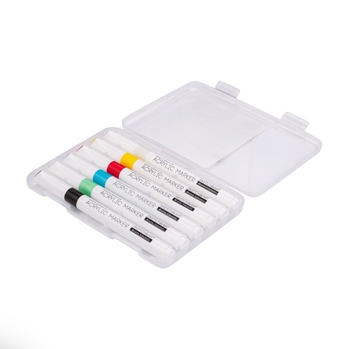 Набор из 6 акриловых маркеров «SKETCH&ART» для рисования, декорирования, дизайнерских работ на любых поверхностях: холст, бумага, дерево, пластик, металл, камень, стекло, одежда, керамика.Корпус маркеров изготовлен из полипропилена - он легкий и ударопрочный. Плотно защелкивающийся колпачок обеспечивает долгую сохранность чернил от высыхания.Маркер имеет пулевидный наконечник из износостойкого волокна с шириной линии 1-3 мм. Нетоксичные пигментные чернила на водной основе с высокой степенью укрывистости быстро сохнут на поверхности, оставляя яркий след. Краски до высыхания можно смешать или растушевать кистью для достижения плавных переходов.Маркеры упакованы в картонную упаковку с эффектом Soft Touch и узнаваемым дизайном всей линейки «Sketch&Art». Размер: 105 x 145 x 15 мм.