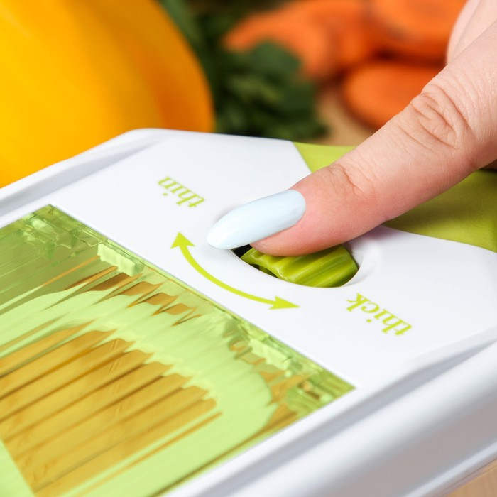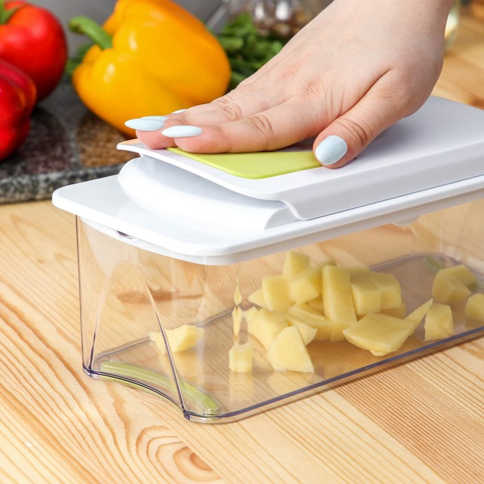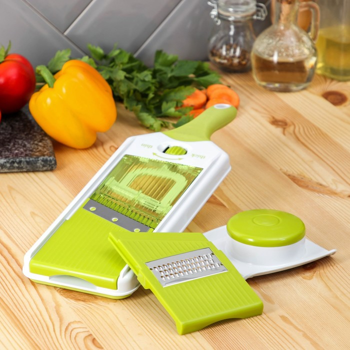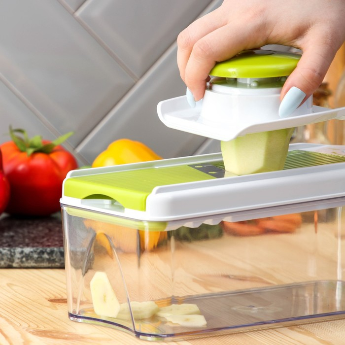 Овощерезка - шинковка со сменными насадками и контейнером Доляна, 6 насадок, 14×12,5×38,1 см, цвет белый, зелёный