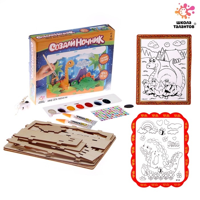 Набор для творчества: создай ночник из дерева и раскраска из пластика «Динозавры»
