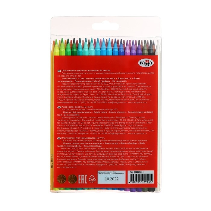 Цветные пластиковые карандаши "ГАММА" серии "Мультики" выполнены в стильном шестигранном корпусе из высококачественного пластика. В наборе 36 цветов: желтый, красный, зеленый темный, светло-голубой, темно-коричневый, черный, оранжевый, розовый, зеленый, синий, фиолетовый, фиалковый, желто-зеленый, желтый темный, телесный, голубой, кармин розовый, коричневый, белый, оранжевый темный, красно-коричневый, бордовый, бирюзовый, серый темный, желтый оливковый, кирпичный, лилово-розовый, краплак, маджента, кобальт синий, ультрамарин, сапфировый, кобальт бирюзовый, сиреневый, зеленый болотный. Диаметр грифеля – 3 мм. Проклеенный ударопрочный грифель не крошится во время заточки и не ломается даже после падения. Корпус карандаша диаметром 7 мм и длиной 174 мм изготовлен из пластика. За яркость и высокую укрывистость отвечают качественные пигменты в составе. Ребенку не придется сильно давить на карандаш – рисунок получится ярким и равномерно закрашенным. Упаковка – прозрачная пластиковая коробка с европодвесом.