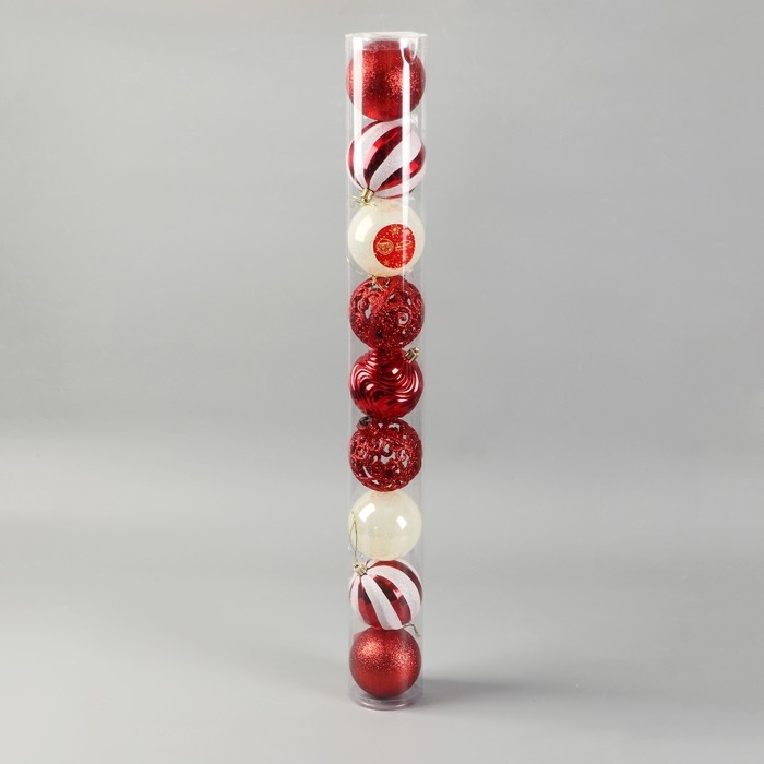 Набор шаров пластик d-8 см, 9 шт "Мелодия" орнамент полосы, бело-красный