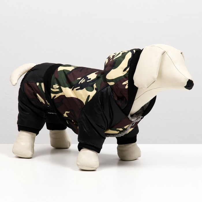 Модный дизайн комбинезона выполнен камуфляжном стиле, что позволяет выделиться на прогулке и подчеркнуть индивидуальность вашего питомца.
