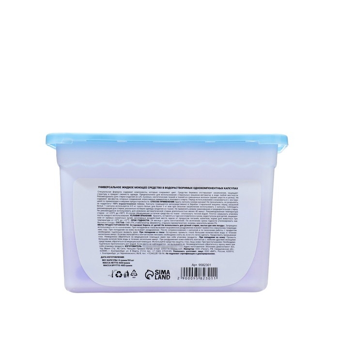 Способ применения: Брать капсулу сухими руками! Не прокалывать, не разрывать, не надрезать! 100% водорастворимая пленка. Капсула помещается непосредственно барабан стиральной машины перед загрузкой белья: 1 капсула используется 4-5 кг сухого белья, для более 5 кг или при сильном загрязнении использовать 2 капсулы. Соблюдать рекомендации для стирки, указанные на бирке одежды (изделия из ткани). Не применять режим замачивания и предварительную стирку. Не рекомендуется использовать для режимов автоматической стирки длительностью менее 40 минут.