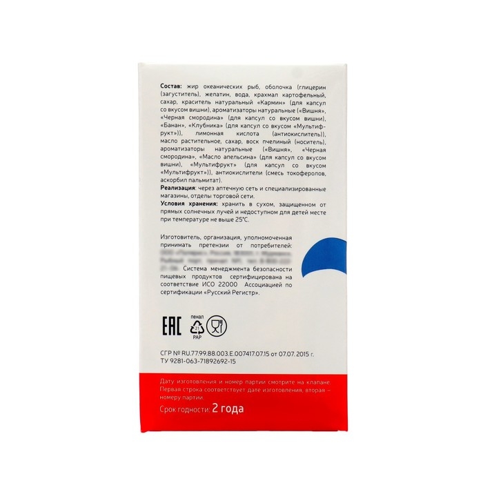 Состав: Жир океанических рыб, оболочка (глицерин (пластификатор), желатин, вода, крахмал картофельный, сахар, ароматизаторы натуральные («Банан», «Клубника» (для капсул со вкусом «Мультифрукт»), «Вишня», «Черная смородина» (для капсул со вкусом вишни)), натуральный краситель «Кармин» (для капсул со вкусом вишни), лимонная кислота (антиокислитель)), растительное масло, сахар, воск пчелиный (носитель), ароматизаторы натуральные («Вишня», «Черная смородина», «Масло апельсина» (для капсул со вкусом вишни), «Мультифрукт» (для капсул со вкусом «Мультифрукт»)), антиокислители (смесь токоферолов, аскорбил пальмитат).