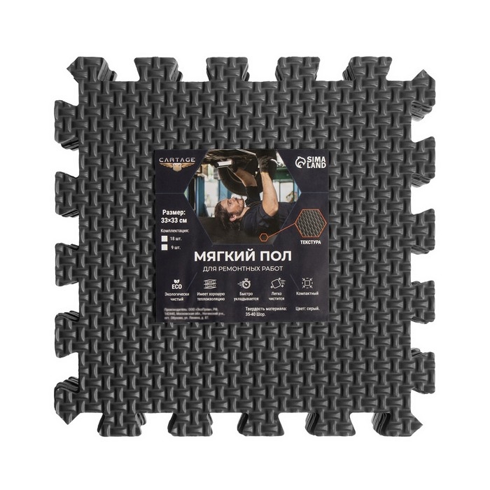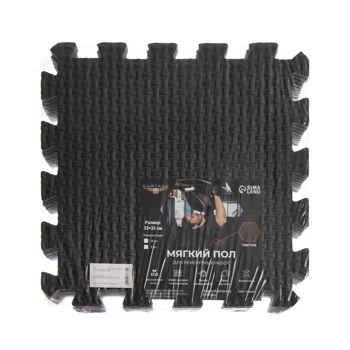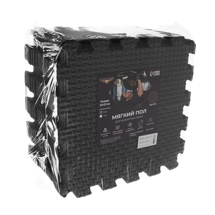 Мягкий пол Cartage прекрасно подойдёт не только для ремонтных работ, но и для игровых зон, детских комнат, ванных комнат и спортивных залов. Удобный для хранения и транспортировки набор состоит из 18 основных модулей, размером 33 х 33 см. Все модули выполнены в виде квадратных плит, соединяющихся между собой. Мягкий пол абсолютно безвреден, обладает хорошей амортизацией, позволяющей смягчать удары от падений и не прихотлив при эксплуатации и в обслуживании.