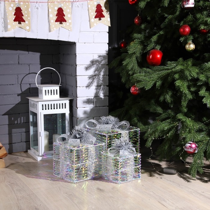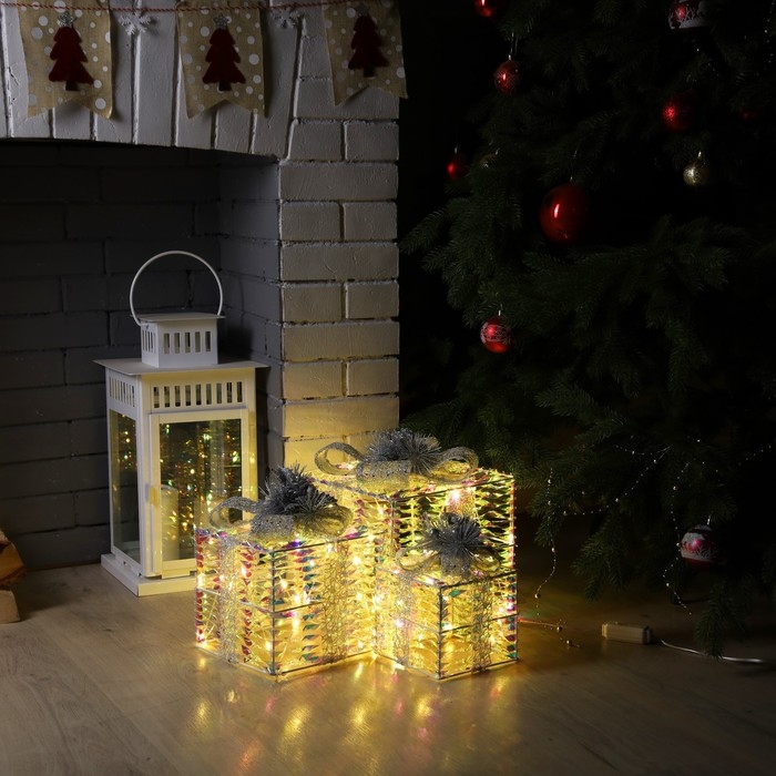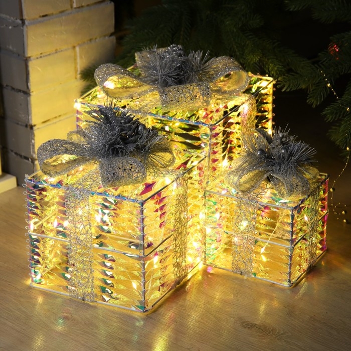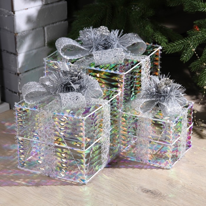 Светодиодная фигура «Блестящие подарки» 15, 20, 25 см, текстиль, металл, 220 В, свечение тёплое белое