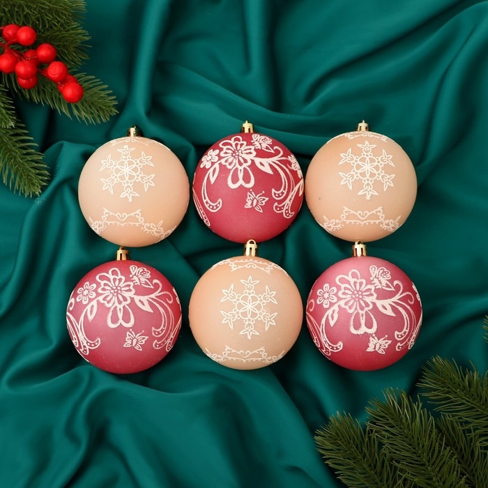Набор шаров пластик d-7,5 см, 6 шт "Ажур" красный бежевый