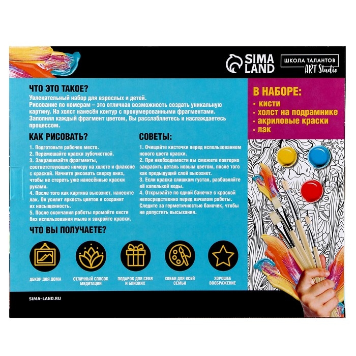 Холст разделён на множество мелких фрагментов, на каждом из которых указано число, соответствующее цвету, которым нужно закрасить данный участок. В набор входят все необходимые оттенки красок, каждый из которых пронумерован. Поначалу, когда вы только возьмёте холст в руки, будет сложно представить, что за чудесная картина получится в итоге! Но уверяем вас, результат превзойдёт все ожидания. Полотно с множеством оттенков, теней и красок будет выглядеть так, словно оно из музея.
