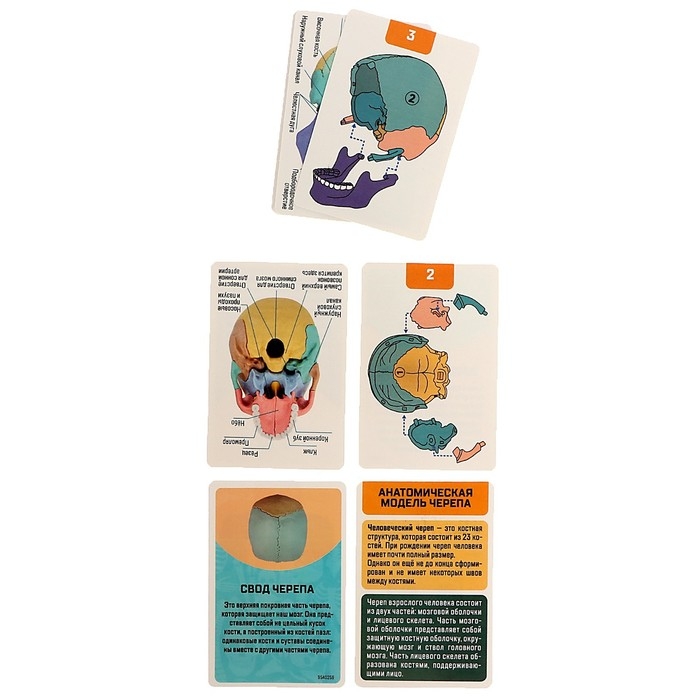 - В комплекте есть 10 двусторонних карточек, в которых написана информация о черепе и его строении.