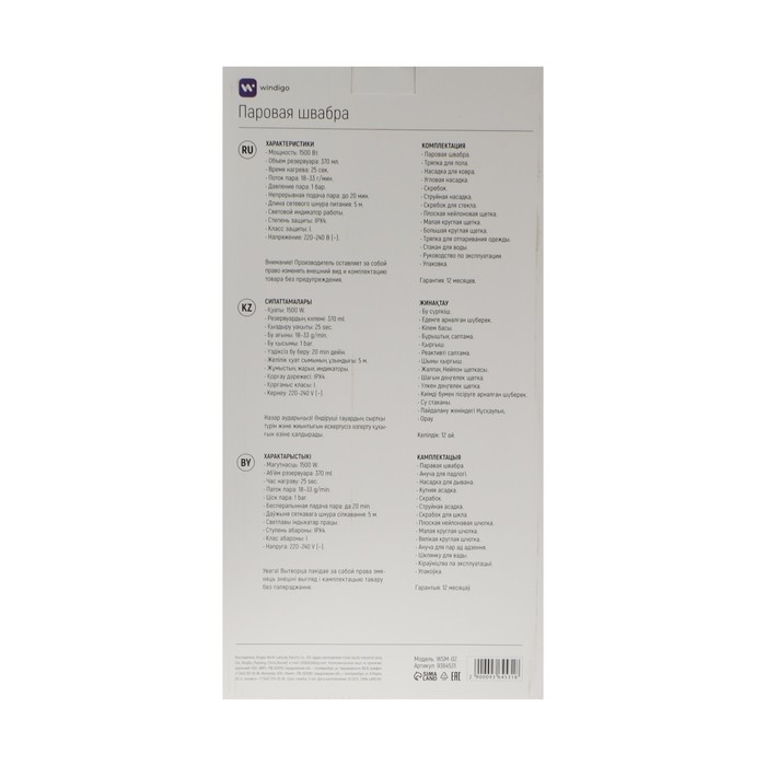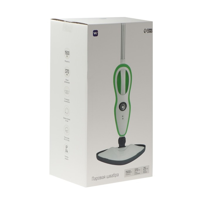 Паровая швабра Windigo WSM-02, 1500 Вт, 370 мл, 18 г/мин, шнур 5 м, бело-зелёный