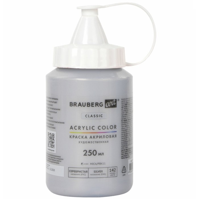 Краска акриловая художественная 250 мл, BRAUBERG ART CLASSIC, Серебристая