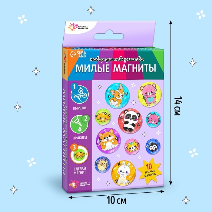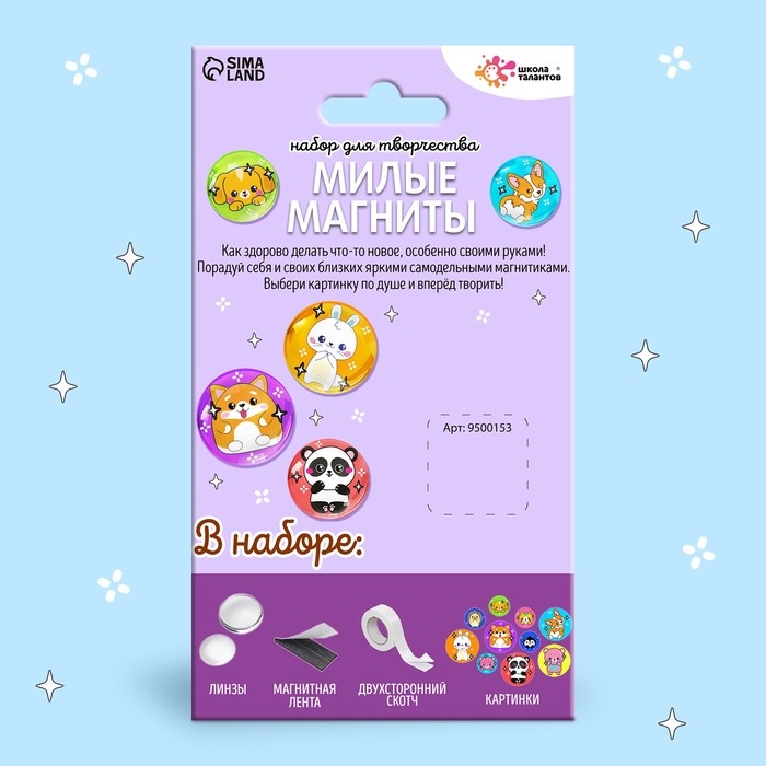 С набором для творчества ребёнок сможет сделать 10 значков своими руками! Готовые изделия станут ярким акцентом в образе — достаточно прикрепить значок к одежде или рюкзаку. Также аксессуары будут милым подарком для близких и друзей.