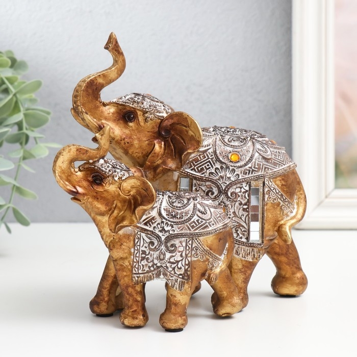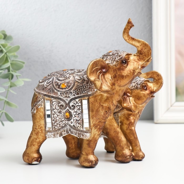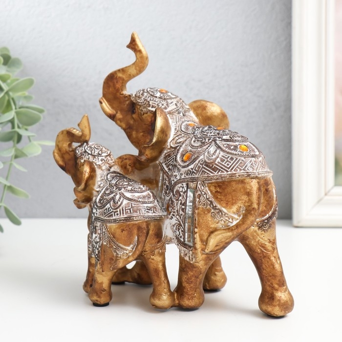 Сувенир полистоун "Слон со слонёнком - попона с узорами и янтарём" 16,5х10х17,5 см