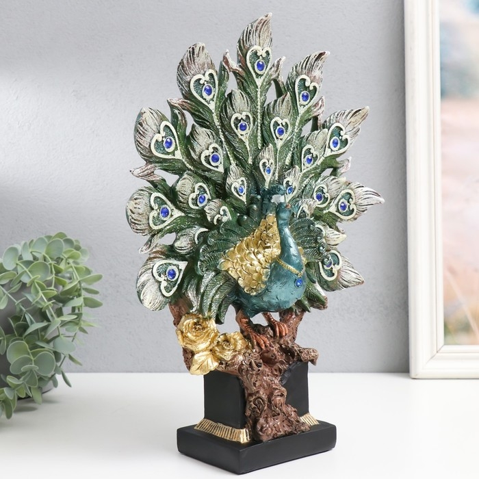 Сувенир полистоун "Павлин с зелёным хвостом с перьями с золотой обводкой" 25,5х9х33 см
