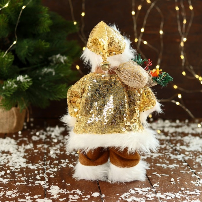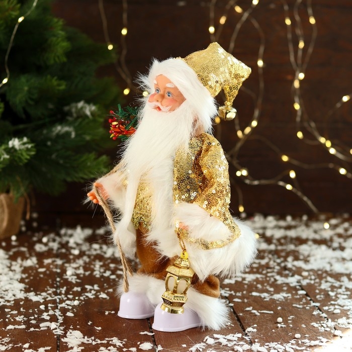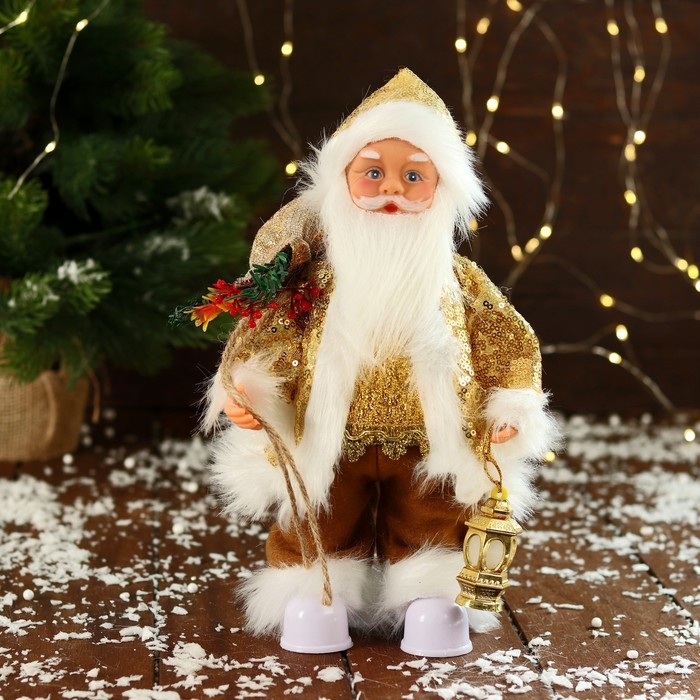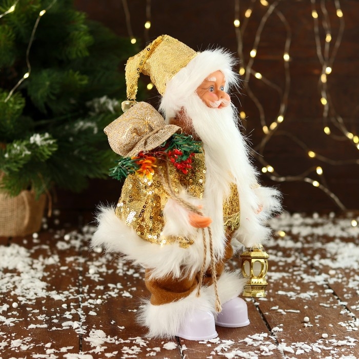 Дед Мороз "В костюме с пайетками, с фонариком" двигается, с подсветкой, 28 см, золото