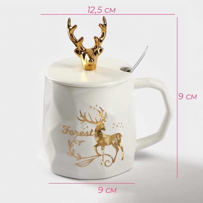 Кружка керамическая с ложкой Доляна «Волшебный лес», 350 мл, цвет белый