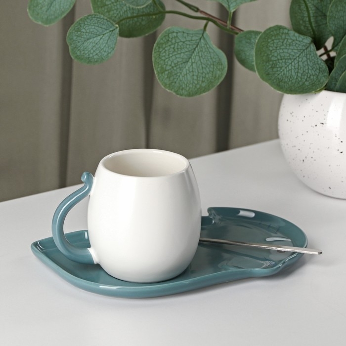 Чайная пара керамическая «Лист», 2 предмета: кружка с ложкой 180 мл, блюдце d=13,5 см, цвет белый