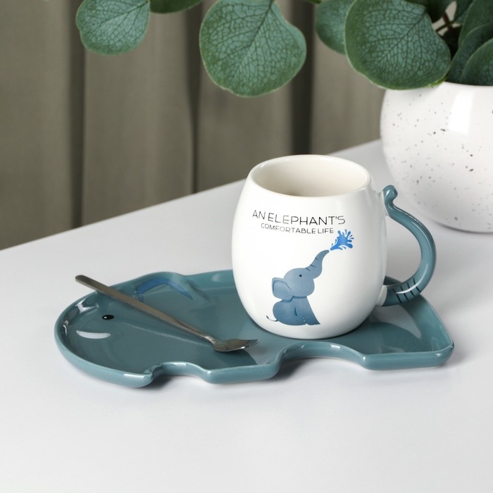 Чайная пара керамическая «Слоник», 2 предмета: кружка с ложкой 220 мл, блюдце 19×12,5 см