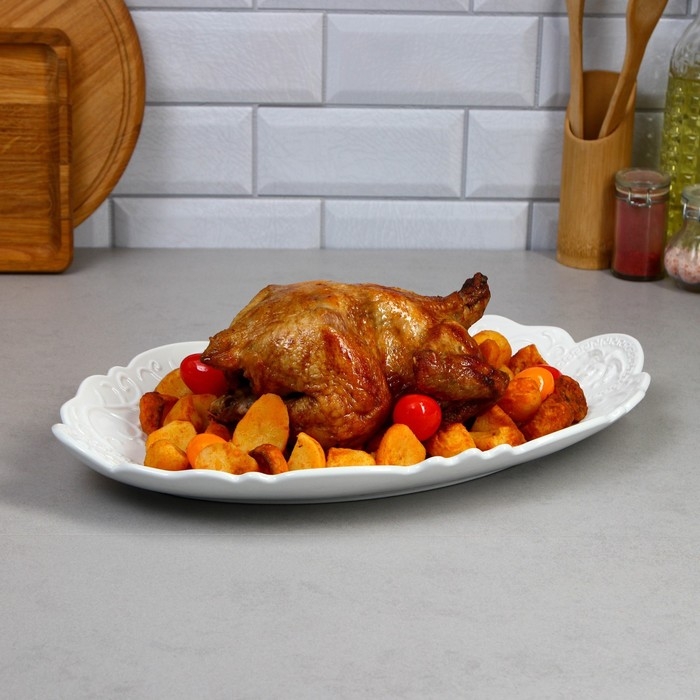 Элегантное фарфоровое блюдо - идеальный выбор для сервировки любых блюд. Блюдо из фарфора украсит любой стол и добавит изысканности вашей еде. Подходит для сервировки салатов, пасты, суши, закусок, а также холодца, рыбы, мяса и других блюд. Белый цвет и его гладкая текстура придают блюду изящный и элегантный вид, который подойдет для разных мероприятий и столовых сервировок. Также может использоваться в качестве декоративной подставки для фруктов, сыра и других украшений на вашем столе. Идеально подходит для сервировки различных явств на столе в кафе, ресторане, столовой или дома. Благодаря его форме и размеру, вы можете разнообразить ваше меню, включая нарезки, печенье, картофель фри, салаты, варенье, фрукты и сладости. Независимо от того, используется ли оно на свадьбе, вечеринке или просто для ужина в кругу семьи, это блюдо будет удачным выбором для подачи.