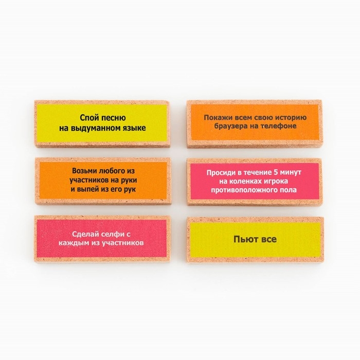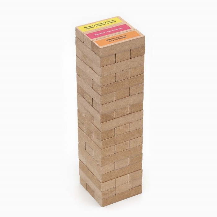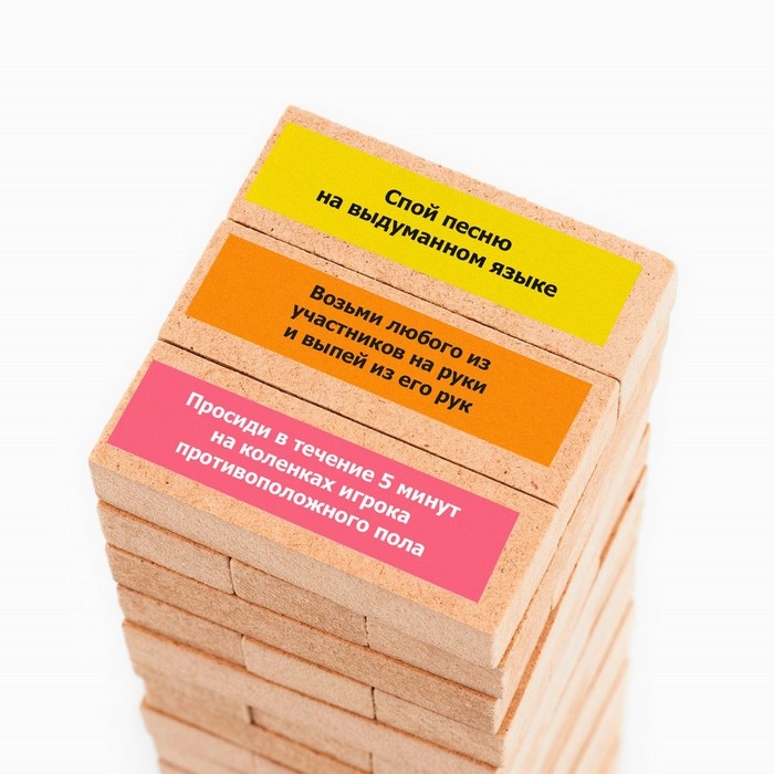 На каждом бруске написано занимательное задание-фант, которое нужно выполнить. Все задания очень неожиданные, необычные и смешные. Тот, кто откажется выполнять задание, выбывает из игры!