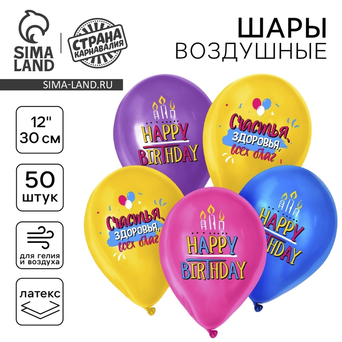 Воздушный шар латексный 12" «С днём рождения», свечки, 50 шт.