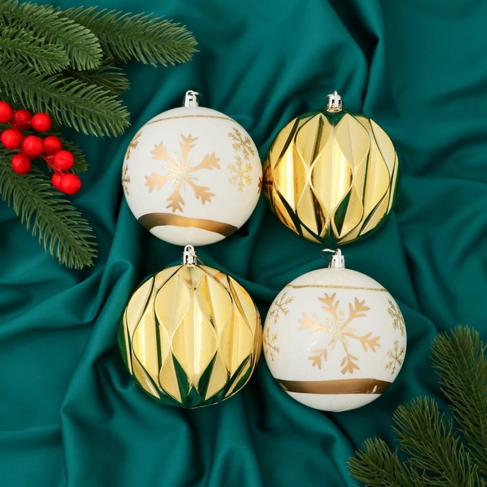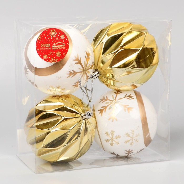 Набор шаров пластик d-10 см, 4 шт "Праздничные узоры" грани, золотисто-белый