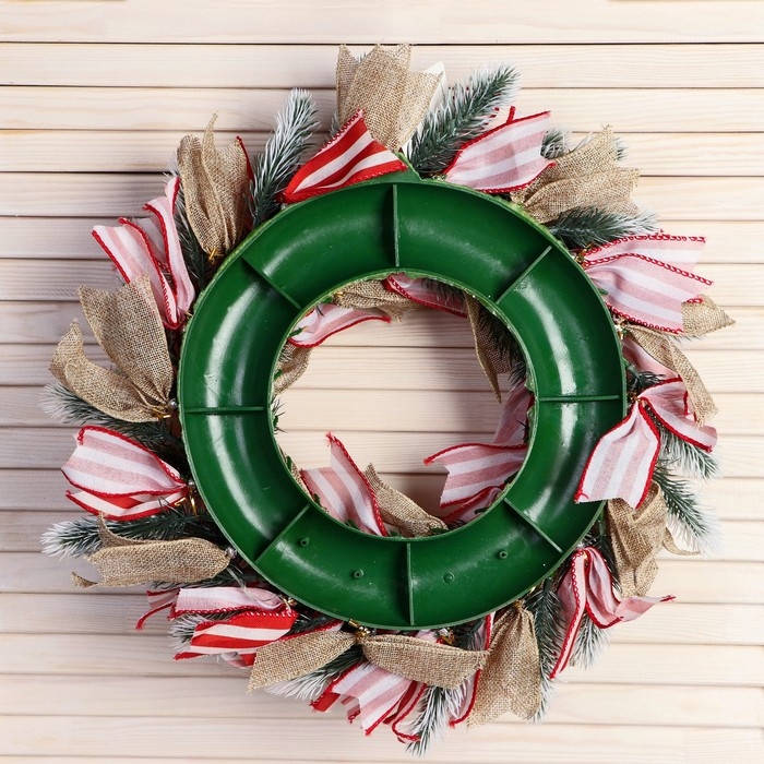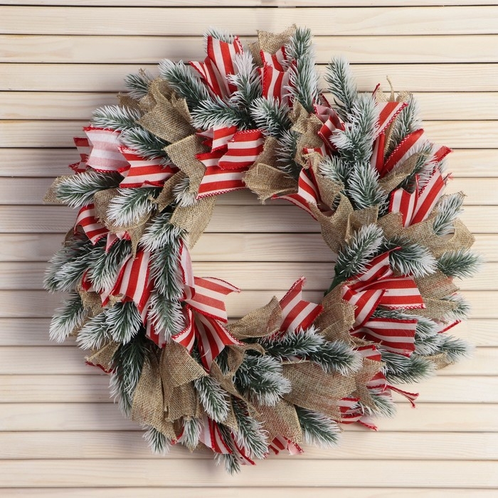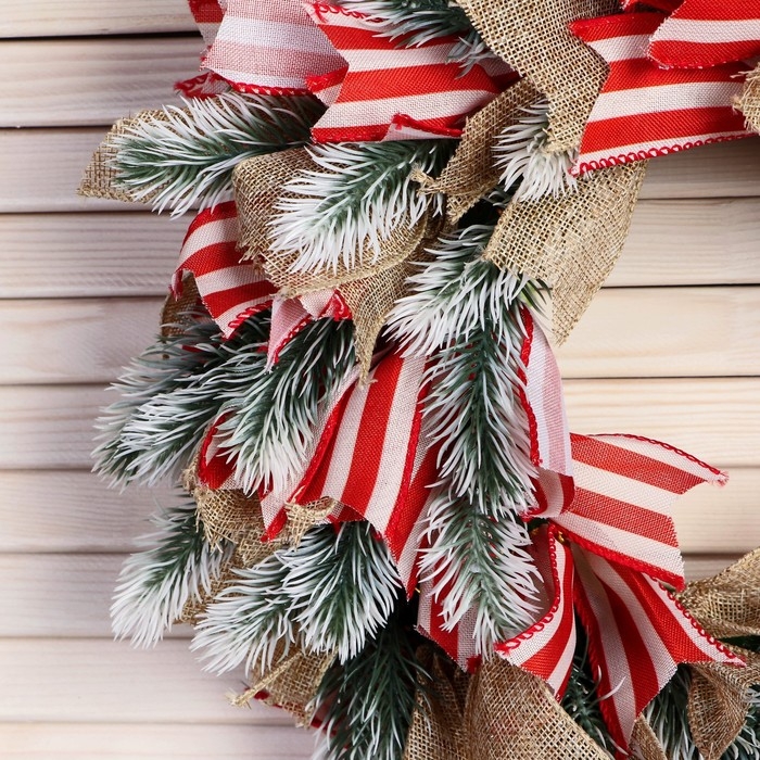 Венок новогодний d- 33 см "Уютная сказка" полосатые ленты и бежевые