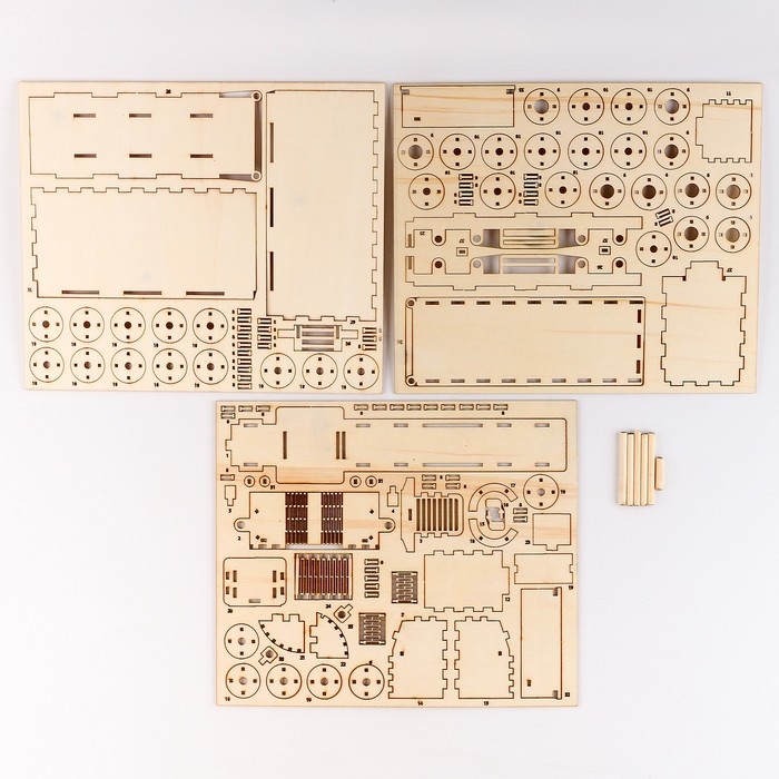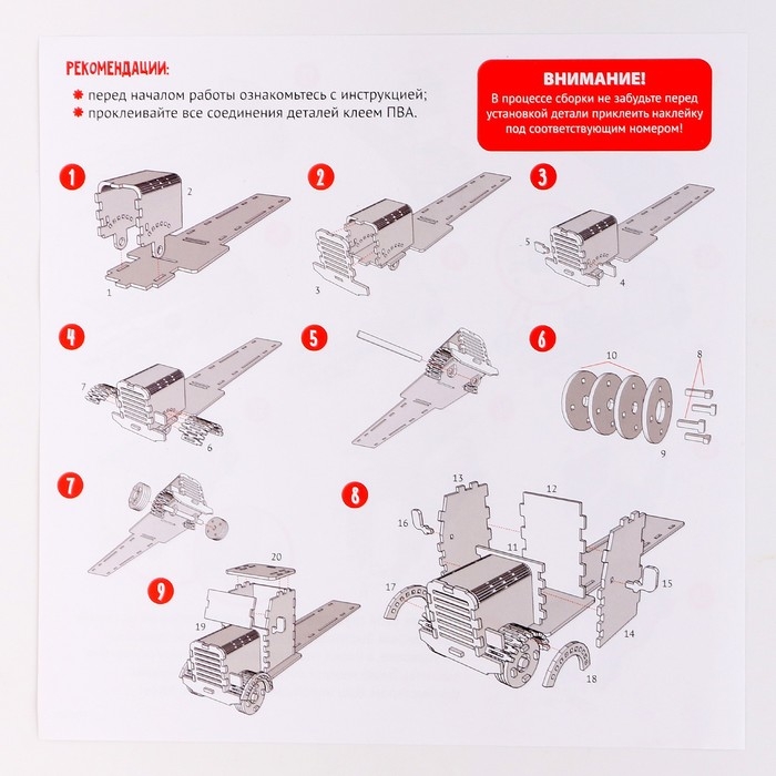 - Элементы вставляются в специальные пазы, поэтому для сборки 3D-конструктора клей не понадобится. Но для лучшего скрепления деталей между собой можно их проклеить ПВА (в комплект не входит).