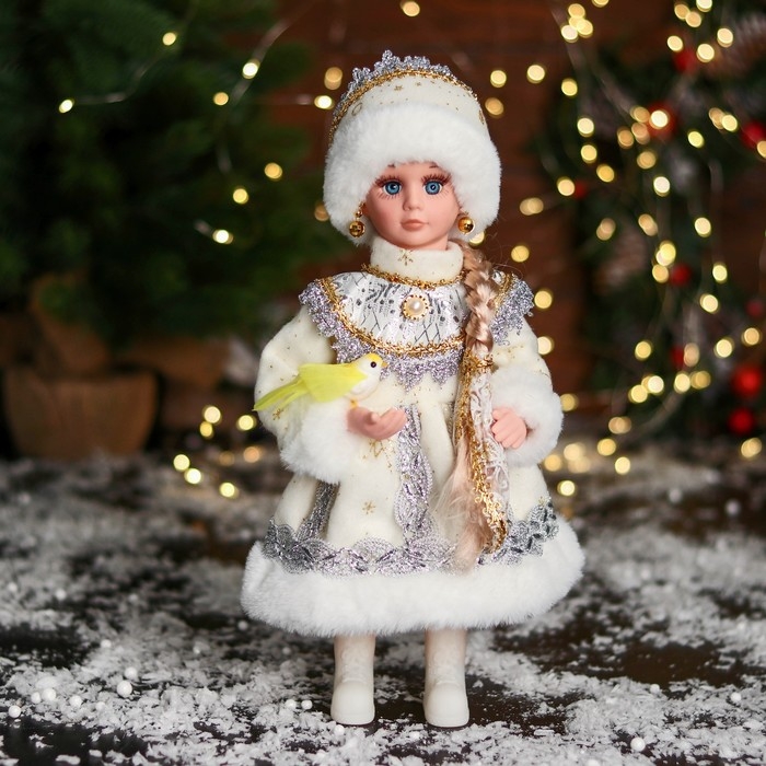 Снегурочка "В шубке с кружевами и бусинкой" 30 см, серебро