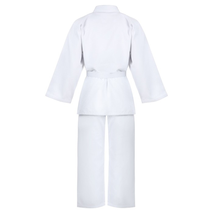 Кимоно предназначено для занятий дзюдо. Изготовлено из хлопка и полиэстера, ткань хорошо впитывает влагу и пропускает воздух. В комплект входят белый пояс, куртка и брюки с дополнительным уплотнением колен.