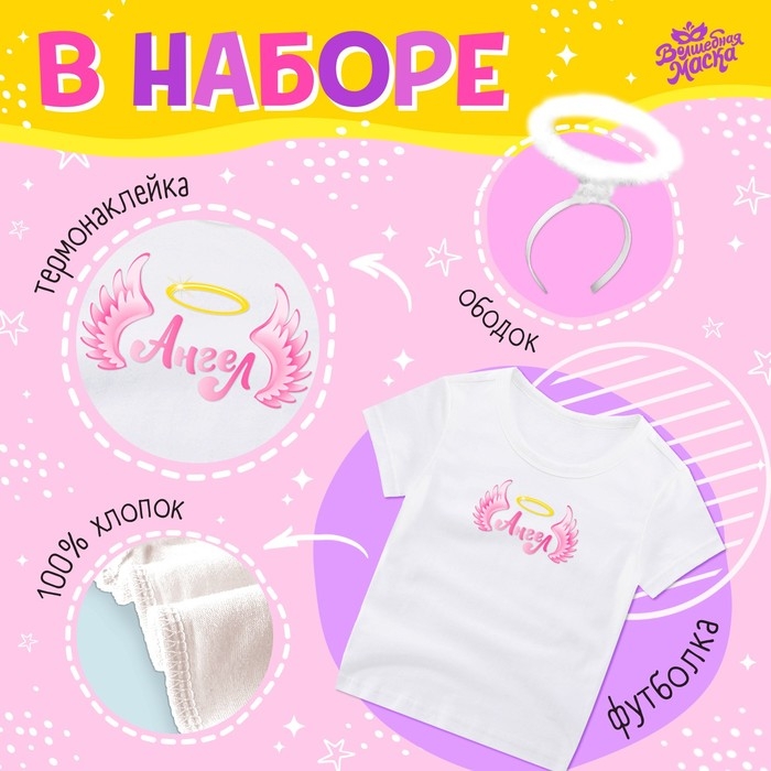 С набором «Ангелочек» ваша малышка станет настоящей звездой на детской вечеринке и поразит всех гостей! С ним вы составите полноценный образ, ведь в комплекте есть футболка, юбка, крылья, ободок и термонаклейка. Создавайте яркие эмоции и воспоминания на целый год вперёд себе и ребёнку!