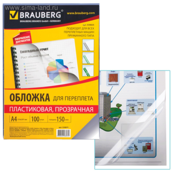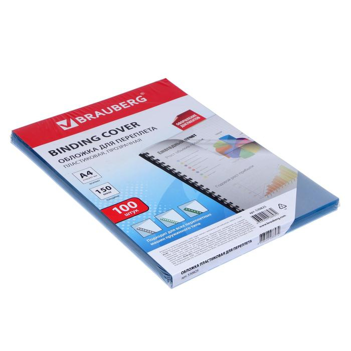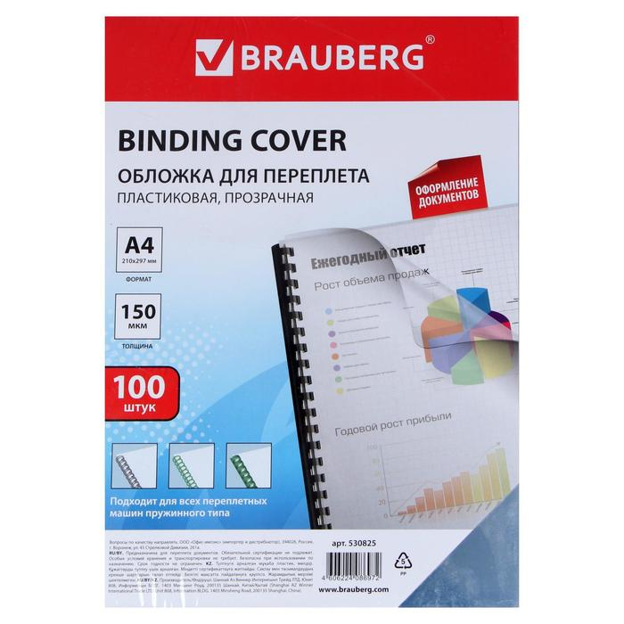 Обложки для переплета A4, 150 мкм, 100 листов, пластиковые, прозрачные бесцветные, BRAUBERG 530825