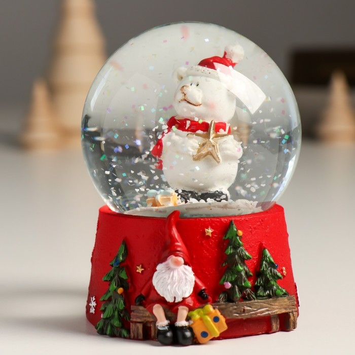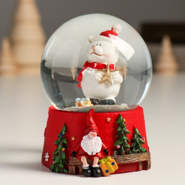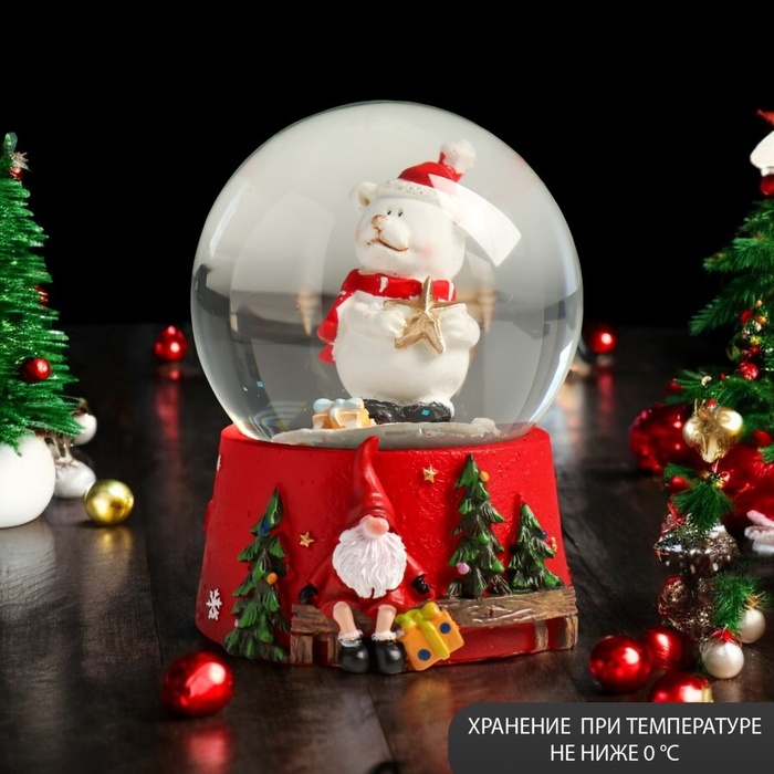 Сувенир полистоун водяной шар "Белый мишка в новогоднем колпаке со звездочкой" 7х8х9 см