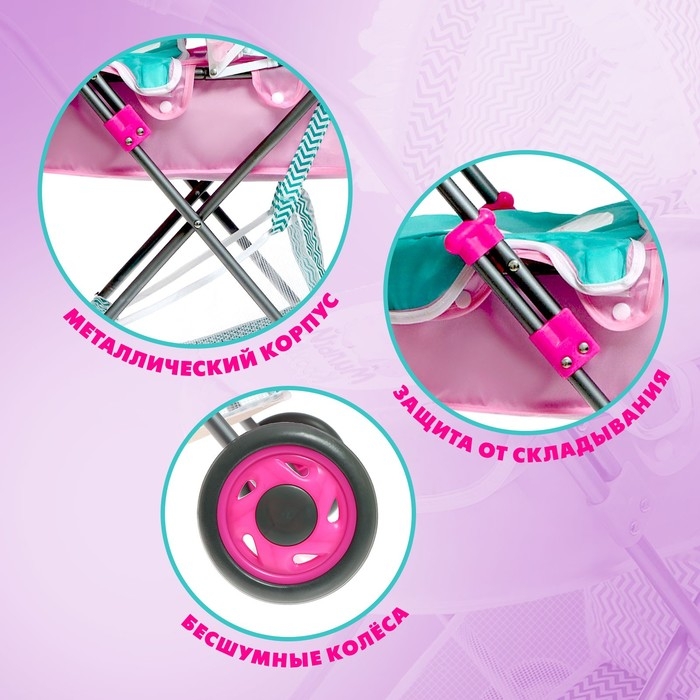 - Коляска складывается и занимает мало места. Корзина и сумка в комплекте будут служить местом хранения для всех необходимых вещей ребёнка и его пупса.