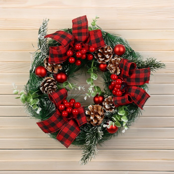 Венок новогодний d- 26 см "Уютная сказка" бантики в клетку шишки шарики