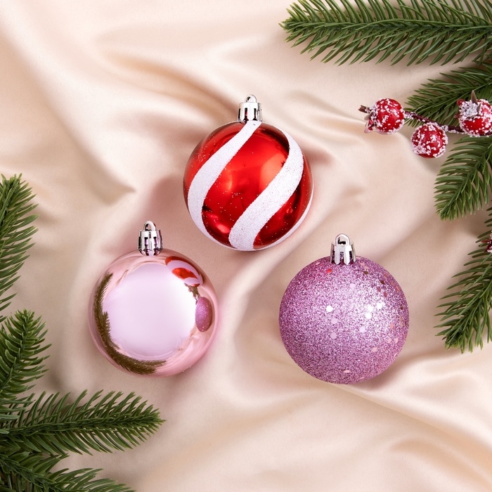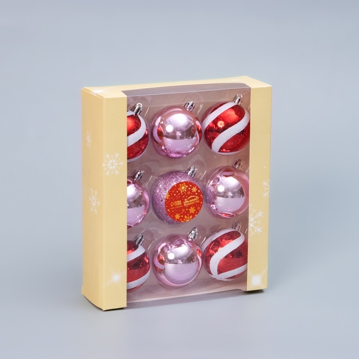 Набор шаров пластик d-6 см, 9 шт "Адель" полосы, бело-красный розовый