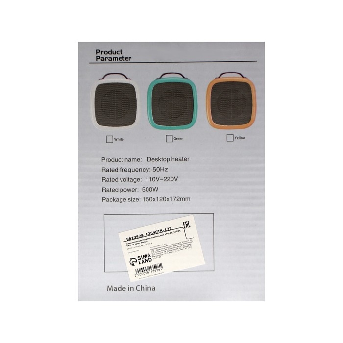 Мини тепловентилятор настольный LTO-01, 500Вт, 4м2, от сети, белый