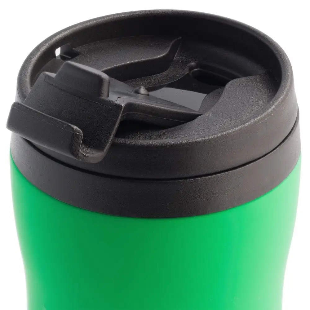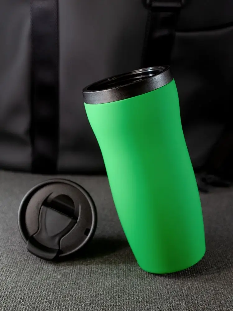 Двухслойная конструкция из нержавеющей стали снаружи и пищевого пластика внутри. Герметичная завинчивающаяся крышка с откидным клапаном для питья. Покрытие софт-тач. В отверстие в крышке можно вставить шнурок для удобного ношения стакана на руке. Шнурок в комплект не входит.